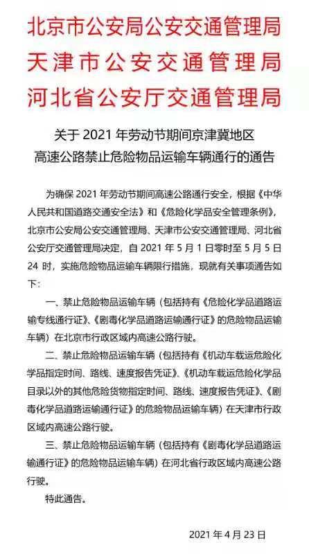 為確保2021年五一勞動(dòng)節(jié)期間高速公路通行安全,根據(jù)《中華人民共和國(guó)道路交通安全法》和《危險(xiǎn)化學(xué)品安全管理?xiàng)l例》,4月23日,北京市公安局公安交通管理局、天津市公安交通管理局、河北省公安廳交通管理局發(fā)布《關(guān)于2021年勞動(dòng)節(jié)期間京津冀地區(qū)高速公路禁止物品運(yùn)輸車輛通行的通告》,通告決定,自2021年5月1日零時(shí)至5月5日24時(shí),實(shí)施物品運(yùn)輸車輛限行措施。
