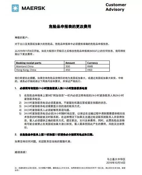 出口至美國或加拿大的危險(xiǎn)品,危險(xiǎn)品申報(bào)單中必須提供準(zhǔn)確的危險(xiǎn)品申報(bào)信息。從2019年11月8日開始,如在大船預(yù)計(jì)開船日之后修改危險(xiǎn)品申報(bào)單(MDGF)上的任何信息,馬士基將收取更改費(fèi)。